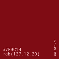 Цвет #7F0C14 в цветовой модели RGB обозначается тремя октетами (127, 12, 20) в десятичном формате и #7F0C14 в шестнадцатиричном (hex) формате, которые являются интенсивностью красного 127 (hex 7F), интенсивность зелёного 12 (hex 0C) и интенсивность синего 20 (hex 14).