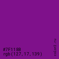 Цвет #7F118B в цветовой модели RGB обозначается тремя октетами (127, 17, 139) в десятичном формате и #7F118B в шестнадцатиричном (hex) формате, которые являются интенсивностью красного 127 (hex 7F), интенсивность зелёного 17 (hex 11) и интенсивность синего 139 (hex 8B).