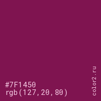 Цвет #7F1450 в цветовой модели RGB обозначается тремя октетами (127, 20, 80) в десятичном формате и #7F1450 в шестнадцатиричном (hex) формате, которые являются интенсивностью красного 127 (hex 7F), интенсивность зелёного 20 (hex 14) и интенсивность синего 80 (hex 50).