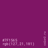 Цвет #7F1565 в цветовой модели RGB обозначается тремя октетами (127, 21, 101) в десятичном формате и #7F1565 в шестнадцатиричном (hex) формате, которые являются интенсивностью красного 127 (hex 7F), интенсивность зелёного 21 (hex 15) и интенсивность синего 101 (hex 65).
