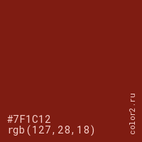 Цвет #7F1C12 в цветовой модели RGB обозначается тремя октетами (127, 28, 18) в десятичном формате и #7F1C12 в шестнадцатиричном (hex) формате, которые являются интенсивностью красного 127 (hex 7F), интенсивность зелёного 28 (hex 1C) и интенсивность синего 18 (hex 12).