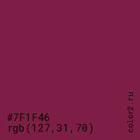 Цвет #7F1F46 в цветовой модели RGB обозначается тремя октетами (127, 31, 70) в десятичном формате и #7F1F46 в шестнадцатиричном (hex) формате, которые являются интенсивностью красного 127 (hex 7F), интенсивность зелёного 31 (hex 1F) и интенсивность синего 70 (hex 46).