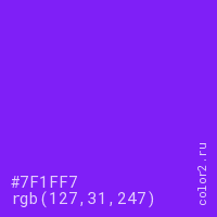 Цвет #7F1FF7 в цветовой модели RGB обозначается тремя октетами (127, 31, 247) в десятичном формате и #7F1FF7 в шестнадцатиричном (hex) формате, которые являются интенсивностью красного 127 (hex 7F), интенсивность зелёного 31 (hex 1F) и интенсивность синего 247 (hex F7).