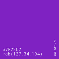 Цвет #7F22C2 в цветовой модели RGB обозначается тремя октетами (127, 34, 194) в десятичном формате и #7F22C2 в шестнадцатиричном (hex) формате, которые являются интенсивностью красного 127 (hex 7F), интенсивность зелёного 34 (hex 22) и интенсивность синего 194 (hex C2).