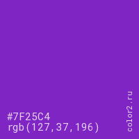 Цвет #7F25C4 в цветовой модели RGB обозначается тремя октетами (127, 37, 196) в десятичном формате и #7F25C4 в шестнадцатиричном (hex) формате, которые являются интенсивностью красного 127 (hex 7F), интенсивность зелёного 37 (hex 25) и интенсивность синего 196 (hex C4).