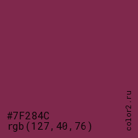 Цвет #7F284C в цветовой модели RGB обозначается тремя октетами (127, 40, 76) в десятичном формате и #7F284C в шестнадцатиричном (hex) формате, которые являются интенсивностью красного 127 (hex 7F), интенсивность зелёного 40 (hex 28) и интенсивность синего 76 (hex 4C).