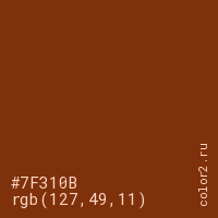 Цвет #7F310B в цветовой модели RGB обозначается тремя октетами (127, 49, 11) в десятичном формате и #7F310B в шестнадцатиричном (hex) формате, которые являются интенсивностью красного 127 (hex 7F), интенсивность зелёного 49 (hex 31) и интенсивность синего 11 (hex 0B).