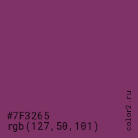 Цвет #7F3265 в цветовой модели RGB обозначается тремя октетами (127, 50, 101) в десятичном формате и #7F3265 в шестнадцатиричном (hex) формате, которые являются интенсивностью красного 127 (hex 7F), интенсивность зелёного 50 (hex 32) и интенсивность синего 101 (hex 65).