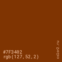 Цвет #7F3402 в цветовой модели RGB обозначается тремя октетами (127, 52, 2) в десятичном формате и #7F3402 в шестнадцатиричном (hex) формате, которые являются интенсивностью красного 127 (hex 7F), интенсивность зелёного 52 (hex 34) и интенсивность синего 2 (hex 02).