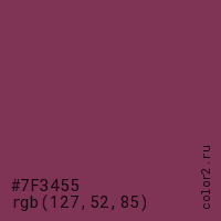 Цвет #7F3455 в цветовой модели RGB обозначается тремя октетами (127, 52, 85) в десятичном формате и #7F3455 в шестнадцатиричном (hex) формате, которые являются интенсивностью красного 127 (hex 7F), интенсивность зелёного 52 (hex 34) и интенсивность синего 85 (hex 55).