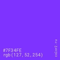 Цвет #7F34FE в цветовой модели RGB обозначается тремя октетами (127, 52, 254) в десятичном формате и #7F34FE в шестнадцатиричном (hex) формате, которые являются интенсивностью красного 127 (hex 7F), интенсивность зелёного 52 (hex 34) и интенсивность синего 254 (hex FE).