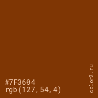 Цвет #7F3604 в цветовой модели RGB обозначается тремя октетами (127, 54, 4) в десятичном формате и #7F3604 в шестнадцатиричном (hex) формате, которые являются интенсивностью красного 127 (hex 7F), интенсивность зелёного 54 (hex 36) и интенсивность синего 4 (hex 04).