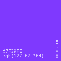Цвет #7F39FE в цветовой модели RGB обозначается тремя октетами (127, 57, 254) в десятичном формате и #7F39FE в шестнадцатиричном (hex) формате, которые являются интенсивностью красного 127 (hex 7F), интенсивность зелёного 57 (hex 39) и интенсивность синего 254 (hex FE).