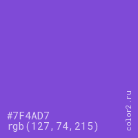 Цвет #7F4AD7 в цветовой модели RGB обозначается тремя октетами (127, 74, 215) в десятичном формате и #7F4AD7 в шестнадцатиричном (hex) формате, которые являются интенсивностью красного 127 (hex 7F), интенсивность зелёного 74 (hex 4A) и интенсивность синего 215 (hex D7).