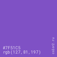 Цвет #7F51C5 в цветовой модели RGB обозначается тремя октетами (127, 81, 197) в десятичном формате и #7F51C5 в шестнадцатиричном (hex) формате, которые являются интенсивностью красного 127 (hex 7F), интенсивность зелёного 81 (hex 51) и интенсивность синего 197 (hex C5).