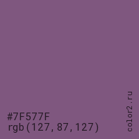 Цвет #7F577F в цветовой модели RGB обозначается тремя октетами (127, 87, 127) в десятичном формате и #7F577F в шестнадцатиричном (hex) формате, которые являются интенсивностью красного 127 (hex 7F), интенсивность зелёного 87 (hex 57) и интенсивность синего 127 (hex 7F).