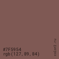 Цвет #7F5954 в цветовой модели RGB обозначается тремя октетами (127, 89, 84) в десятичном формате и #7F5954 в шестнадцатиричном (hex) формате, которые являются интенсивностью красного 127 (hex 7F), интенсивность зелёного 89 (hex 59) и интенсивность синего 84 (hex 54).