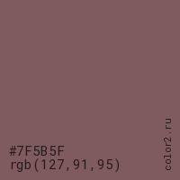 Цвет #7F5B5F в цветовой модели RGB обозначается тремя октетами (127, 91, 95) в десятичном формате и #7F5B5F в шестнадцатиричном (hex) формате, которые являются интенсивностью красного 127 (hex 7F), интенсивность зелёного 91 (hex 5B) и интенсивность синего 95 (hex 5F).