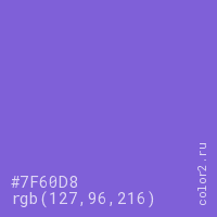 Цвет #7F60D8 в цветовой модели RGB обозначается тремя октетами (127, 96, 216) в десятичном формате и #7F60D8 в шестнадцатиричном (hex) формате, которые являются интенсивностью красного 127 (hex 7F), интенсивность зелёного 96 (hex 60) и интенсивность синего 216 (hex D8).