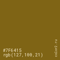 Цвет #7F6415 в цветовой модели RGB обозначается тремя октетами (127, 100, 21) в десятичном формате и #7F6415 в шестнадцатиричном (hex) формате, которые являются интенсивностью красного 127 (hex 7F), интенсивность зелёного 100 (hex 64) и интенсивность синего 21 (hex 15).