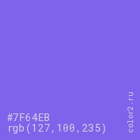 Цвет #7F64EB в цветовой модели RGB обозначается тремя октетами (127, 100, 235) в десятичном формате и #7F64EB в шестнадцатиричном (hex) формате, которые являются интенсивностью красного 127 (hex 7F), интенсивность зелёного 100 (hex 64) и интенсивность синего 235 (hex EB).