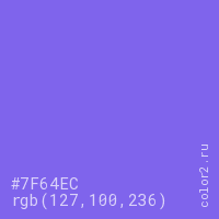 Цвет #7F64EC в цветовой модели RGB обозначается тремя октетами (127, 100, 236) в десятичном формате и #7F64EC в шестнадцатиричном (hex) формате, которые являются интенсивностью красного 127 (hex 7F), интенсивность зелёного 100 (hex 64) и интенсивность синего 236 (hex EC).