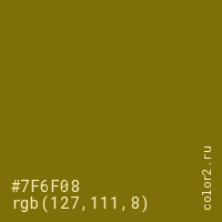 Цвет #7F6F08 в цветовой модели RGB обозначается тремя октетами (127, 111, 8) в десятичном формате и #7F6F08 в шестнадцатиричном (hex) формате, которые являются интенсивностью красного 127 (hex 7F), интенсивность зелёного 111 (hex 6F) и интенсивность синего 8 (hex 08).