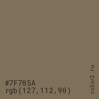 Цвет #7F705A в цветовой модели RGB обозначается тремя октетами (127, 112, 90) в десятичном формате и #7F705A в шестнадцатиричном (hex) формате, которые являются интенсивностью красного 127 (hex 7F), интенсивность зелёного 112 (hex 70) и интенсивность синего 90 (hex 5A).