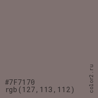 Цвет #7F7170 в цветовой модели RGB обозначается тремя октетами (127, 113, 112) в десятичном формате и #7F7170 в шестнадцатиричном (hex) формате, которые являются интенсивностью красного 127 (hex 7F), интенсивность зелёного 113 (hex 71) и интенсивность синего 112 (hex 70).
