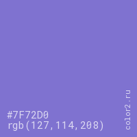 Цвет #7F72D0 в цветовой модели RGB обозначается тремя октетами (127, 114, 208) в десятичном формате и #7F72D0 в шестнадцатиричном (hex) формате, которые являются интенсивностью красного 127 (hex 7F), интенсивность зелёного 114 (hex 72) и интенсивность синего 208 (hex D0).