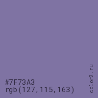 Цвет #7F73A3 в цветовой модели RGB обозначается тремя октетами (127, 115, 163) в десятичном формате и #7F73A3 в шестнадцатиричном (hex) формате, которые являются интенсивностью красного 127 (hex 7F), интенсивность зелёного 115 (hex 73) и интенсивность синего 163 (hex A3).