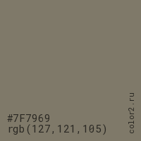 Цвет #7F7969 в цветовой модели RGB обозначается тремя октетами (127, 121, 105) в десятичном формате и #7F7969 в шестнадцатиричном (hex) формате, которые являются интенсивностью красного 127 (hex 7F), интенсивность зелёного 121 (hex 79) и интенсивность синего 105 (hex 69).