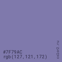 Цвет RGB(127, 121, 172) в процентом отношении количества цвета состоит из 49.8% красного (red), 47.5% зелёного (green) и 67.5% синего (blue).