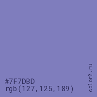 Цвет #7F7DBD в цветовой модели RGB обозначается тремя октетами (127, 125, 189) в десятичном формате и #7F7DBD в шестнадцатиричном (hex) формате, которые являются интенсивностью красного 127 (hex 7F), интенсивность зелёного 125 (hex 7D) и интенсивность синего 189 (hex BD).