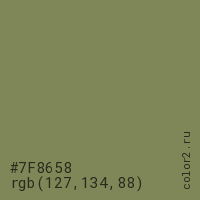 Цвет #7F8658 в цветовой модели RGB обозначается тремя октетами (127, 134, 88) в десятичном формате и #7F8658 в шестнадцатиричном (hex) формате, которые являются интенсивностью красного 127 (hex 7F), интенсивность зелёного 134 (hex 86) и интенсивность синего 88 (hex 58).