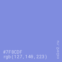 Цвет #7F8CDF в цветовой модели RGB обозначается тремя октетами (127, 140, 223) в десятичном формате и #7F8CDF в шестнадцатиричном (hex) формате, которые являются интенсивностью красного 127 (hex 7F), интенсивность зелёного 140 (hex 8C) и интенсивность синего 223 (hex DF).
