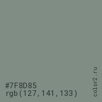 Цвет #7F8D85 в цветовой модели RGB обозначается тремя октетами (127, 141, 133) в десятичном формате и #7F8D85 в шестнадцатиричном (hex) формате, которые являются интенсивностью красного 127 (hex 7F), интенсивность зелёного 141 (hex 8D) и интенсивность синего 133 (hex 85).