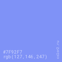 Цвет #7F92F7 в цветовой модели RGB обозначается тремя октетами (127, 146, 247) в десятичном формате и #7F92F7 в шестнадцатиричном (hex) формате, которые являются интенсивностью красного 127 (hex 7F), интенсивность зелёного 146 (hex 92) и интенсивность синего 247 (hex F7).
