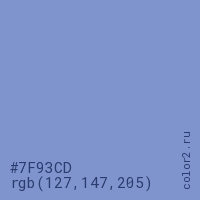 Цвет #7F93CD в цветовой модели RGB обозначается тремя октетами (127, 147, 205) в десятичном формате и #7F93CD в шестнадцатиричном (hex) формате, которые являются интенсивностью красного 127 (hex 7F), интенсивность зелёного 147 (hex 93) и интенсивность синего 205 (hex CD).