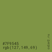 Цвет #7F9545 в цветовой модели RGB обозначается тремя октетами (127, 149, 69) в десятичном формате и #7F9545 в шестнадцатиричном (hex) формате, которые являются интенсивностью красного 127 (hex 7F), интенсивность зелёного 149 (hex 95) и интенсивность синего 69 (hex 45).