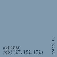 Цвет RGB(127, 152, 172) в процентом отношении количества цвета состоит из 49.8% красного (red), 59.6% зелёного (green) и 67.5% синего (blue).