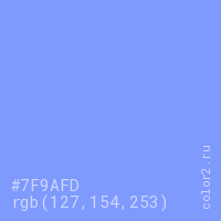 Цвет RGB(127, 154, 253) в процентом отношении количества цвета состоит из 49.8% красного (red), 60.4% зелёного (green) и 99.2% синего (blue).