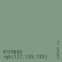 Цвет #7F9B85 в цветовой модели RGB обозначается тремя октетами (127, 155, 133) в десятичном формате и #7F9B85 в шестнадцатиричном (hex) формате, которые являются интенсивностью красного 127 (hex 7F), интенсивность зелёного 155 (hex 9B) и интенсивность синего 133 (hex 85).