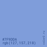 Цвет #7F9DDA в цветовой модели RGB обозначается тремя октетами (127, 157, 218) в десятичном формате и #7F9DDA в шестнадцатиричном (hex) формате, которые являются интенсивностью красного 127 (hex 7F), интенсивность зелёного 157 (hex 9D) и интенсивность синего 218 (hex DA).