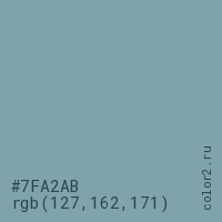 Цвет #7FA2AB в цветовой модели RGB обозначается тремя октетами (127, 162, 171) в десятичном формате и #7FA2AB в шестнадцатиричном (hex) формате, которые являются интенсивностью красного 127 (hex 7F), интенсивность зелёного 162 (hex A2) и интенсивность синего 171 (hex AB).