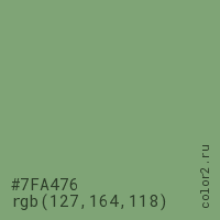 Цвет #7FA476 в цветовой модели RGB обозначается тремя октетами (127, 164, 118) в десятичном формате и #7FA476 в шестнадцатиричном (hex) формате, которые являются интенсивностью красного 127 (hex 7F), интенсивность зелёного 164 (hex A4) и интенсивность синего 118 (hex 76).