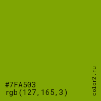 Цвет #7FA503 в цветовой модели RGB обозначается тремя октетами (127, 165, 3) в десятичном формате и #7FA503 в шестнадцатиричном (hex) формате, которые являются интенсивностью красного 127 (hex 7F), интенсивность зелёного 165 (hex A5) и интенсивность синего 3 (hex 03).