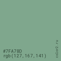 Цвет #7FA78D в цветовой модели RGB обозначается тремя октетами (127, 167, 141) в десятичном формате и #7FA78D в шестнадцатиричном (hex) формате, которые являются интенсивностью красного 127 (hex 7F), интенсивность зелёного 167 (hex A7) и интенсивность синего 141 (hex 8D).