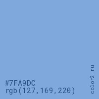 Цвет #7FA9DC в цветовой модели RGB обозначается тремя октетами (127, 169, 220) в десятичном формате и #7FA9DC в шестнадцатиричном (hex) формате, которые являются интенсивностью красного 127 (hex 7F), интенсивность зелёного 169 (hex A9) и интенсивность синего 220 (hex DC).