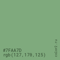 Цвет #7FAA7D в цветовой модели RGB обозначается тремя октетами (127, 170, 125) в десятичном формате и #7FAA7D в шестнадцатиричном (hex) формате, которые являются интенсивностью красного 127 (hex 7F), интенсивность зелёного 170 (hex AA) и интенсивность синего 125 (hex 7D).